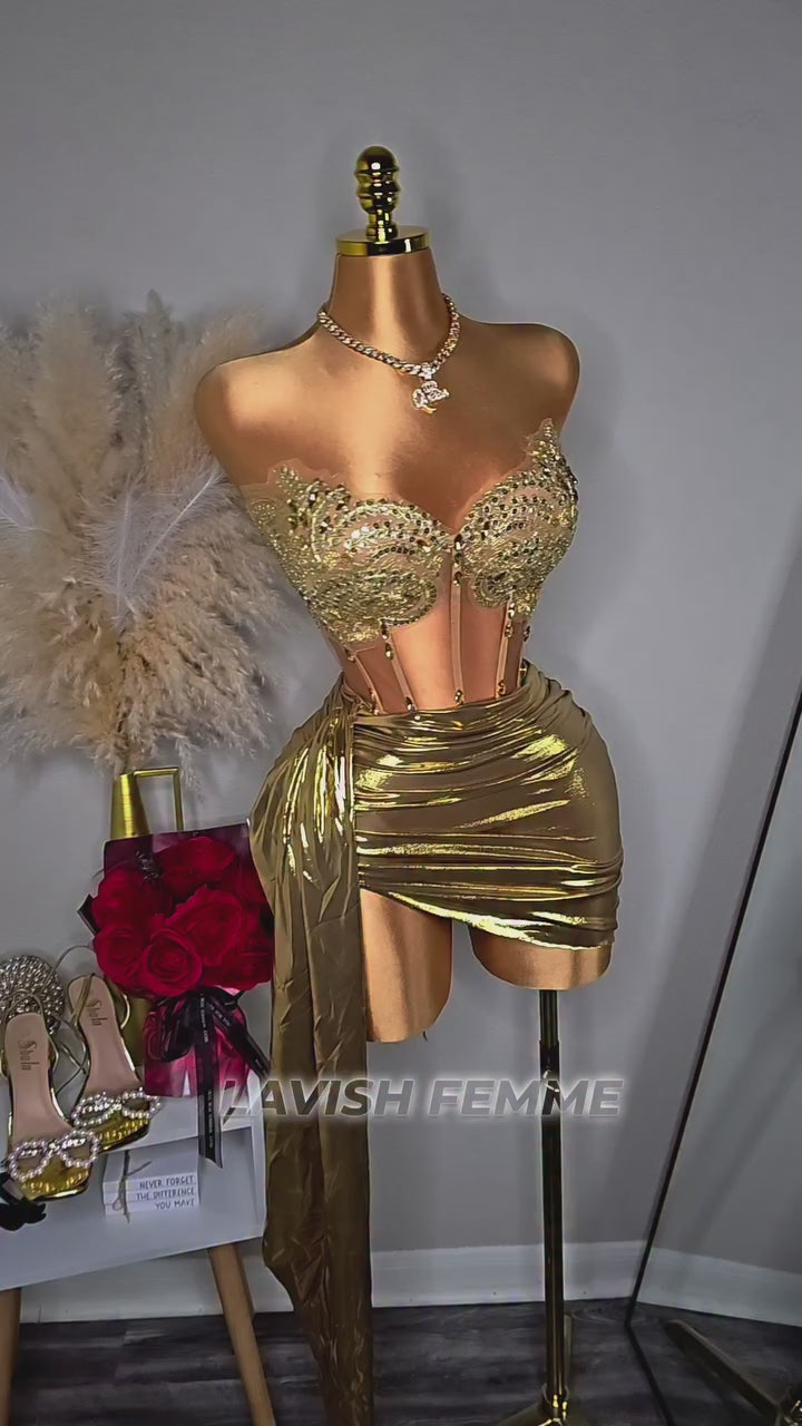 Turn heads in the Golden Goddess Set—a luxe two-piece with a sculpting corset-style top and matching bottom. Designed to cinch, lift, and shine, it’s the perfect statement look for birthdays, nights out, and special occasions.