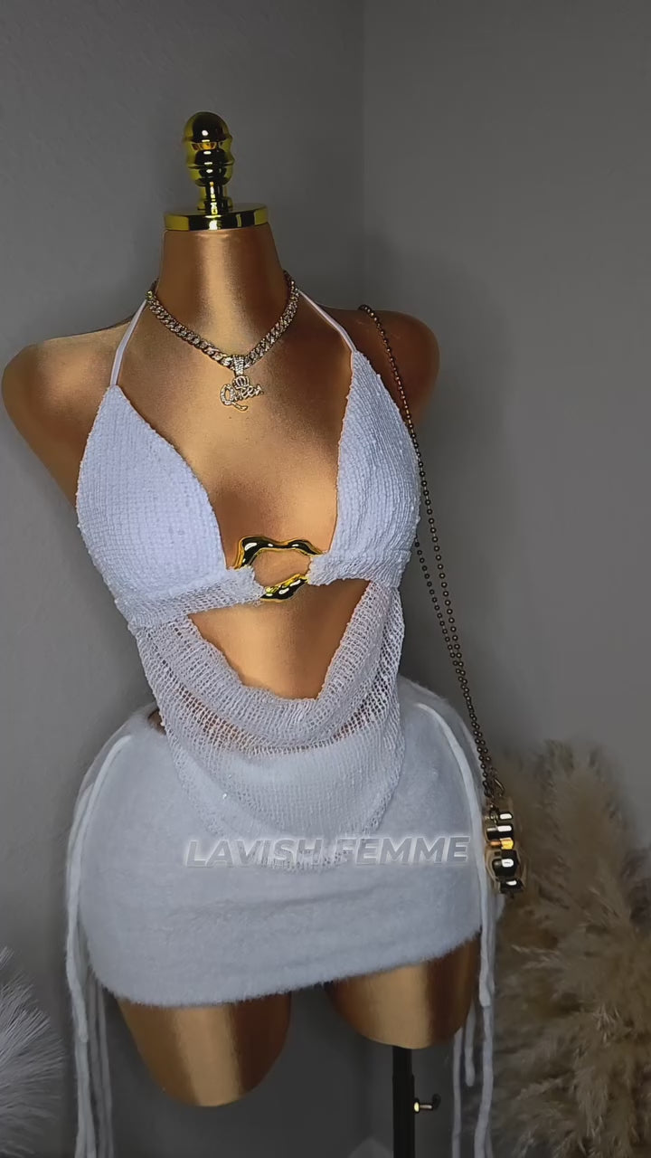 This stunning white two-piece set features a flattering halter-style top and a flowy layered mini skirt that moves beautifully with every step. Feminine, flirty, and impossible to ignore, it’s the perfect outfit for birthdays, brunch, vacations, or any night that deserves a little extra attention.
